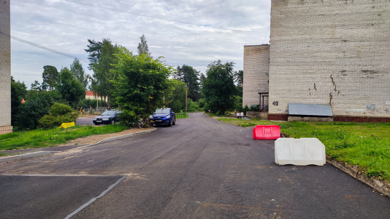 На снимке изображена дворовая дорога с новым асфальтовым покрытием, вдоль которой расположены жилые дома. В центре кадра установлены пластиковые временные ограждения красного и белого цвета. Слева и справа находятся кустарники и деревья. На стене дома виден номер «40». Фотография фиксирует благоустройство территории и меры безопасности в жилом квартале.