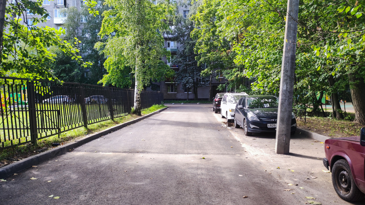 На фотографии изображена придомовая территория с новым асфальтовым покрытием. По левую сторону располагается металлический забор и зелёная зона, справа припаркованы автомобили. В глубине видны жилые многоквартирные дома. Ровное покрытие указывает на недавние дорожные работы, направленные на благоустройство территории и улучшение условий для жителей. Такое фото может использоваться в публикациях о ремонте дорог, городском благоустройстве и модернизации инфраструктуры.