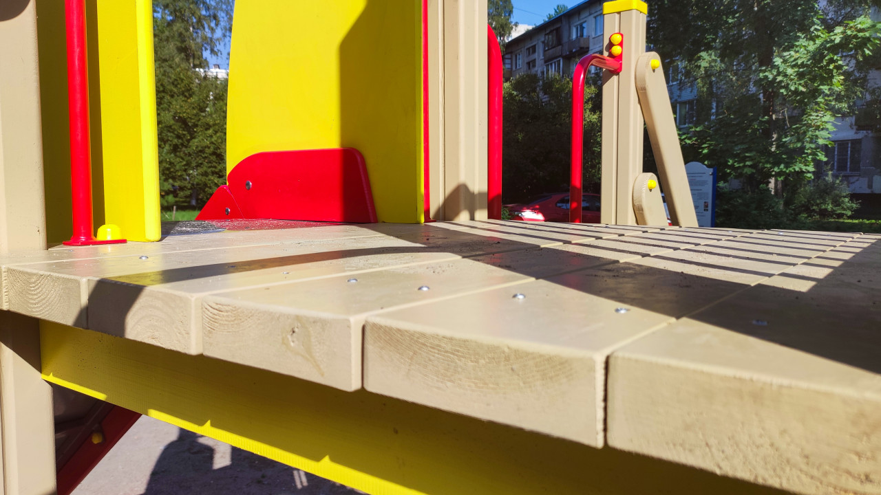 На фотографии крупным планом изображена деревянная платформа детского игрового комплекса. Поверхность состоит из досок, закреплённых металлическими крепежами, по краям видны яркие элементы конструкции — жёлтые панели и красные поручни. На заднем плане заметны деревья и часть жилого массива. Снимок можно использовать для иллюстрации установки и устройства современных игровых комплексов для детей.