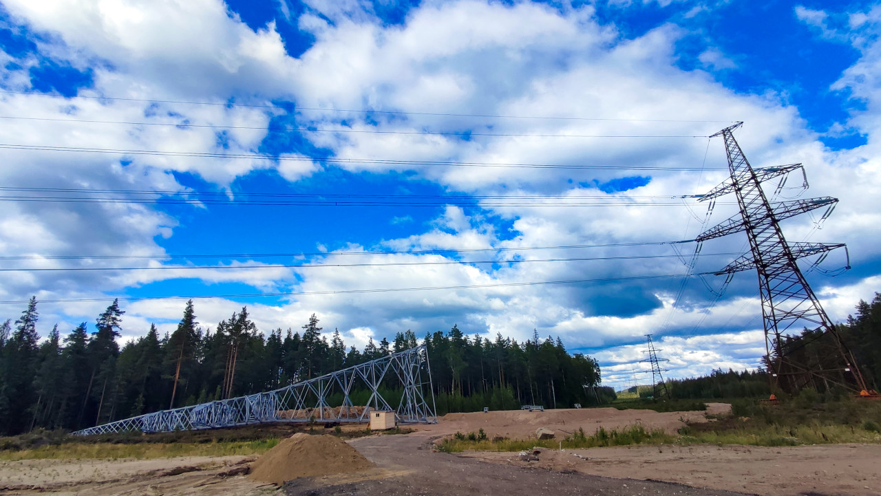 На фото видна строительная площадка у леса, где на земле уложена металлическая опора линии электропередачи. Справа кадра — действующие опоры ЛЭП с натянутыми проводами. На переднем плане заметны насыпи и временные сооружения. Снимок отражает процесс модернизации энергетической системы.