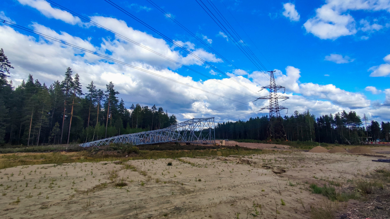 Фотография фиксирует металлическую конструкцию опоры ЛЭП, уложенную на землю для дальнейшего монтажа. Рядом расположена действующая высокая опора с натянутыми проводами. На переднем плане заметен песчаный грунт, на заднем — лесной массив. Снимок иллюстрирует важный этап энергетического строительства.
