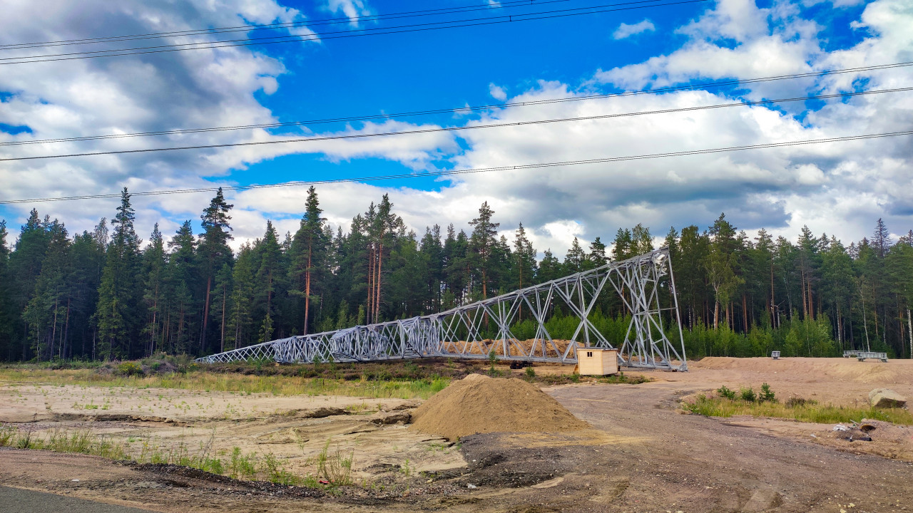 На фотографии показана металлическая опора линии электропередачи, уложенная на земле вдоль строительной площадки. Конструкция собрана из стальных секций и подготовлена для подъёма. Вокруг видны земляные насыпи и лесной массив. Этот кадр фиксирует этап подготовки и монтажа элементов энергетической инфраструктуры.