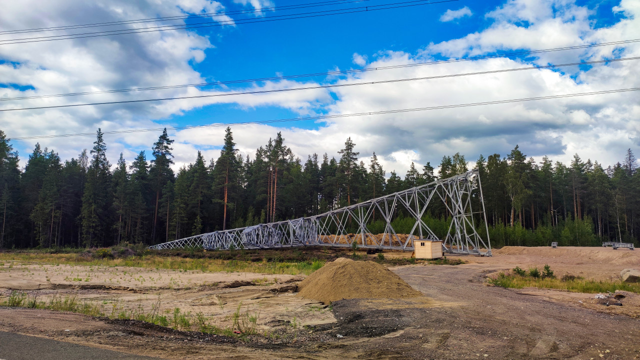На изображении показана металлическая конструкция опоры линии электропередачи, разложенная горизонтально на площадке рядом с лесом. Каркас состоит из металлических ферм, подготовленных для монтажа. На переднем плане видна техника и куча песка, вдали тянутся высоковольтные линии. Снимок демонстрирует этап строительства ЛЭП и подготовку опоры к подъёму и установке.