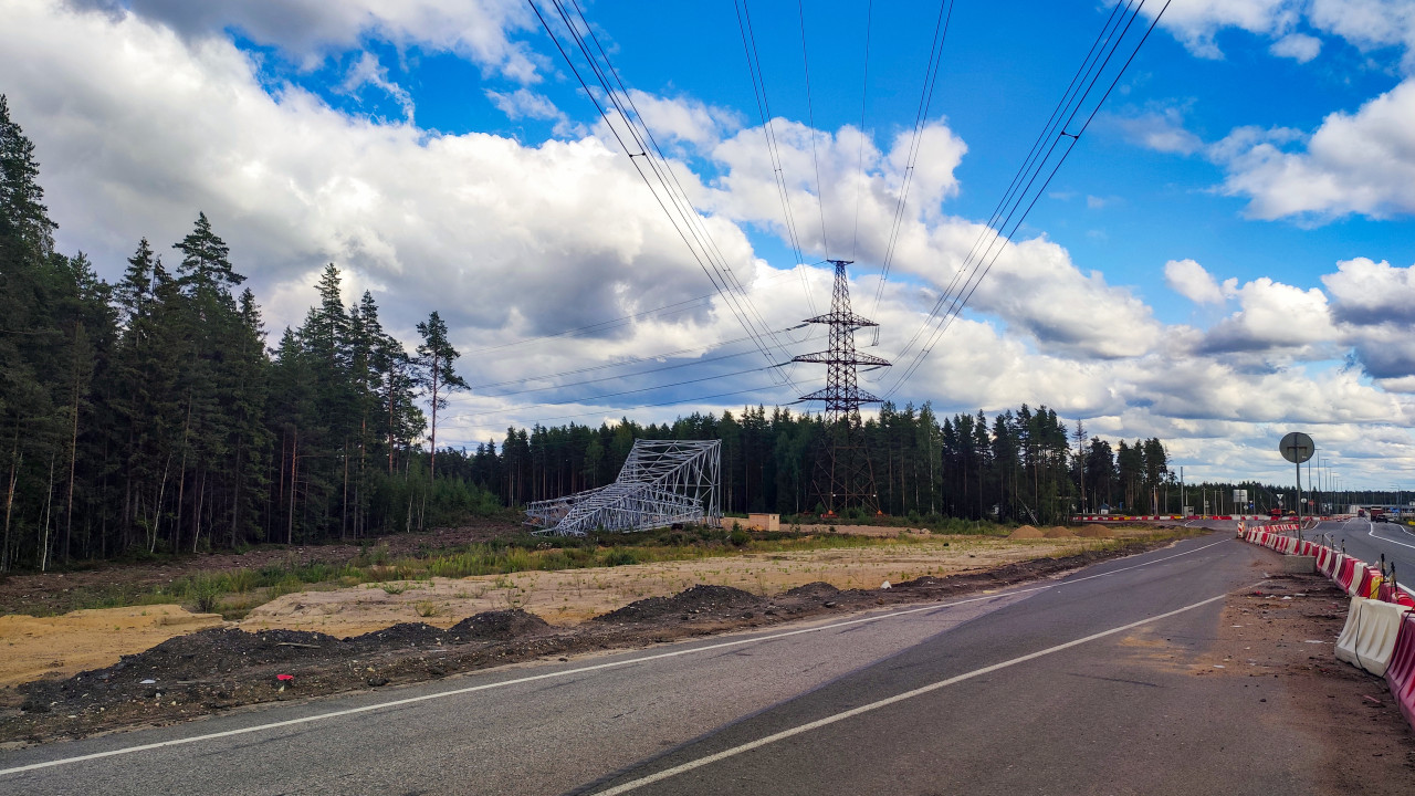 На фото изображены действующие линии электропередачи и металлическая конструкция новой опоры, уложенная на землю рядом с дорогой. На переднем плане асфальтовое покрытие трассы и строительные ограждения. Снимок отражает этап строительства и модернизации энергетической инфраструктуры вблизи транспортных магистралей.
