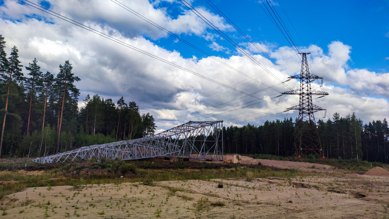 На фотографии изображена металлическая конструкция опоры ЛЭП, уложенная горизонтально на площадке. Рядом возвышается действующая стальная опора с протянутыми линиями электропередачи. На фоне — лес и облачное небо. Снимок демонстрирует промежуточный этап энергетических работ.