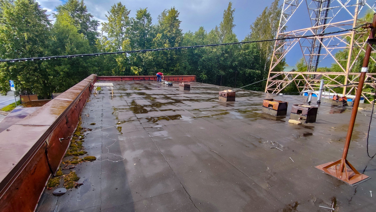 На фото изображена плоская кровля здания с тёмным покрытием, на котором остались мокрые следы после дождя. На поверхности заметны лужи, вентиляционные выходы и металлические элементы. В кадре присутствует человек в красной футболке, выполняющий работы на крыше. На заднем плане видна металлическая мачта с лестницей и зелёные деревья. Фото демонстрирует техническое состояние кровли и необходимость обслуживания для предотвращения протечек.