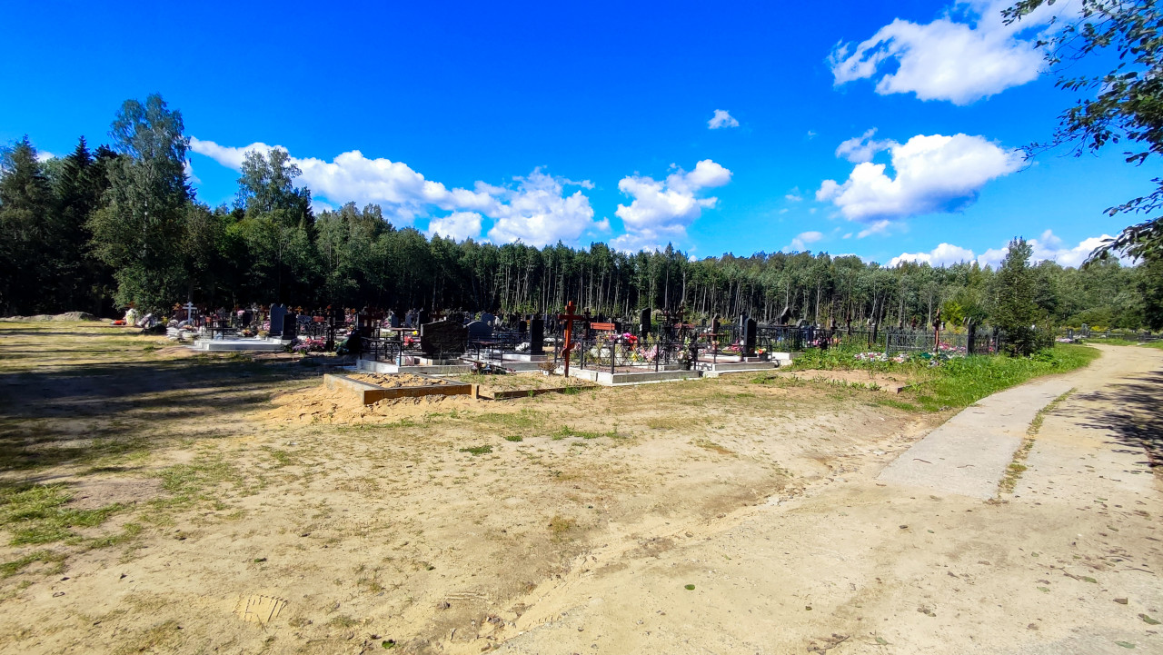 На фотографии изображено кладбище с надгробиями, крестами и металлическими оградами, расположенное на фоне лесного массива. В кадре видна тропинка из бетона и открытая земляная площадка, на которой заметны свежие следы земляных работ. Сцена отражает культурное пространство, связанное с традициями захоронений и памятью усопших. Подобные изображения могут использоваться в материалах о ритуальной архитектуре, социокультурных исследованиях или иллюстрациях к публикациям о местах памяти.