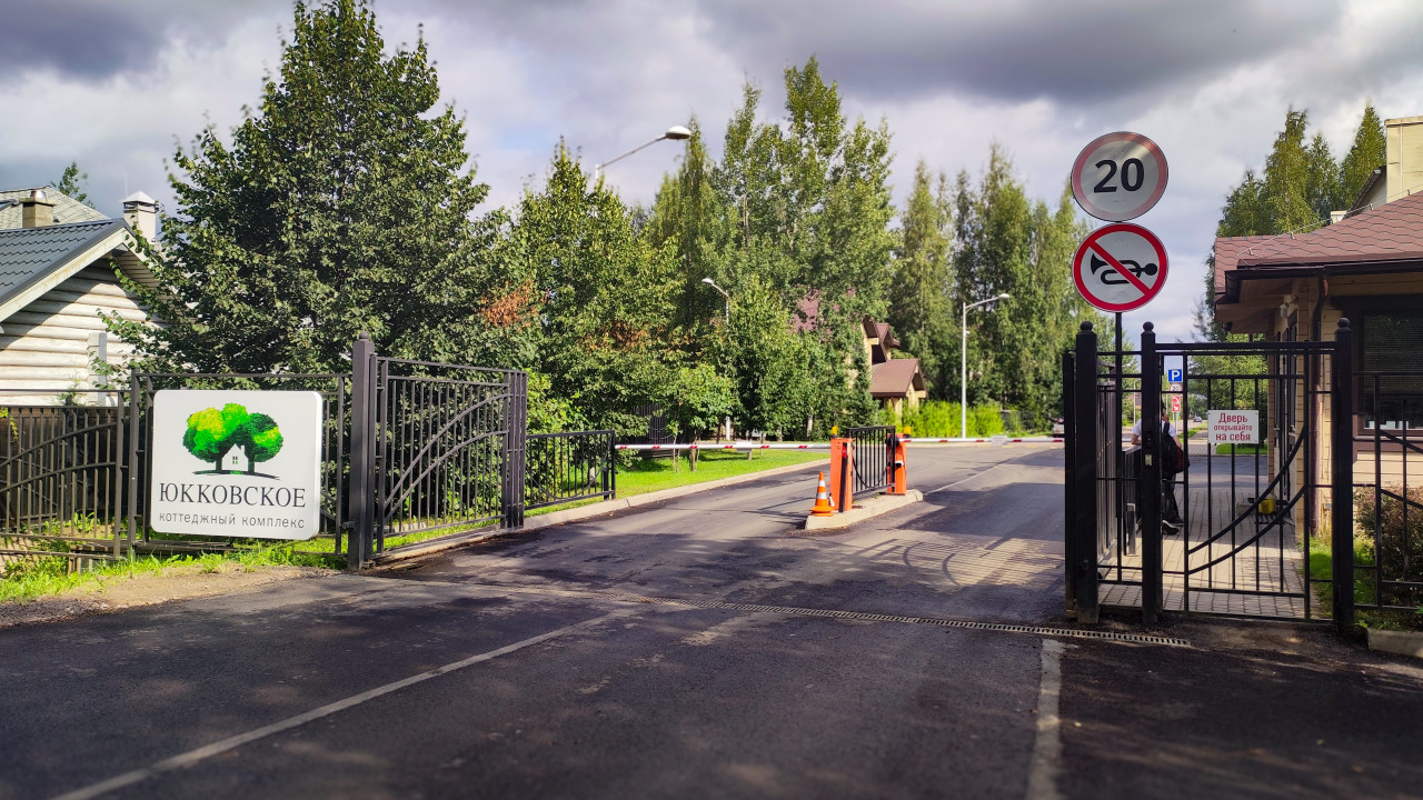 На фотографии изображён въезд в коттеджный комплекс «Юкковское», о чём сообщает установленная у ворот табличка. В кадре видны автоматические ворота, шлагбаум и дорожные знаки: ограничение скорости до 20 км/ч и запрет мотоциклам. По бокам расположены жилые дома и зелёные насаждения. На заднем плане заметны фонари и деревья, создающие атмосферу обжитого жилого посёлка. Снимок может использоваться для иллюстрации загородной инфраструктуры, жилых комплексов и организации охраняемых территорий.