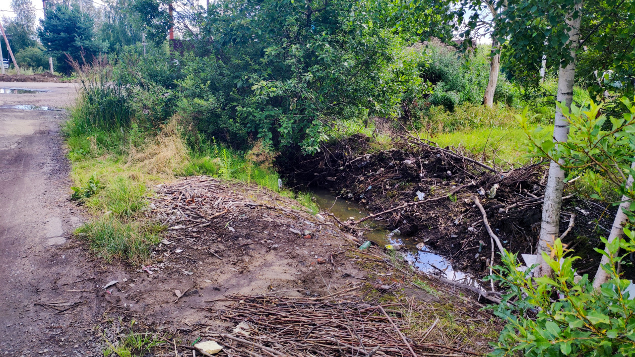 На фотографии изображена придорожная канава, заросшая травой и частично заваленная ветками и бытовым мусором. Вода скапливается между зелёными насаждениями, образуя небольшие застои. На заднем плане видны деревья и кусты, создающие впечатление лесопарковой зоны. Снимок может использоваться для демонстрации проблем ухода за дренажными системами, а также в экологических публикациях о загрязнении окружающей среды.