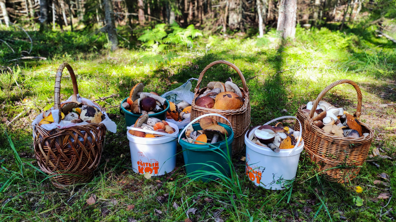 На фото изображены корзины и пластиковые ведра, наполненные различными видами грибов, стоящие на траве в лесной зоне. В корзинах видны подосиновики, подберезовики и белые грибы. На заднем плане просматривается лес с хвойными и лиственными деревьями. Сцена иллюстрирует богатый урожай и традицию заготовки лесных даров. Фото можно использовать в материалах о кулинарии, сельской культуре, экологии и отдыхе на природе.