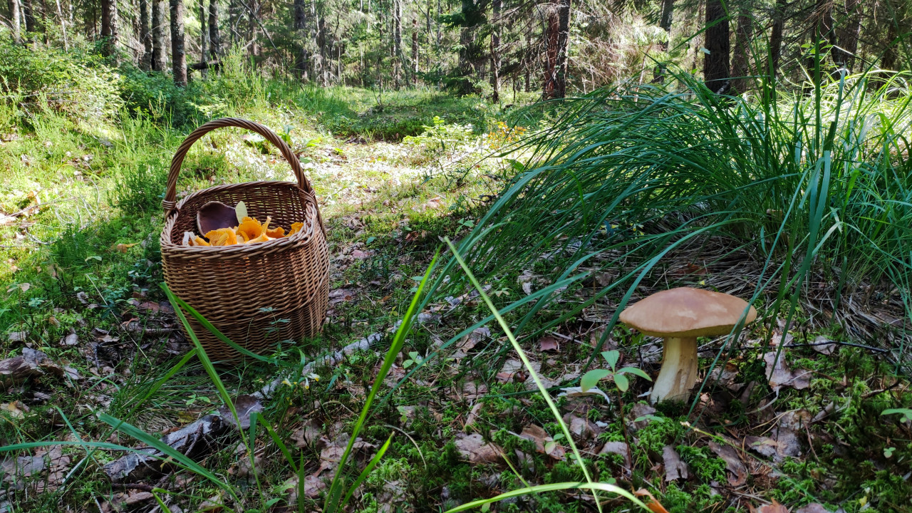 На снимке показана плетёная корзина с собранными лисичками и белыми грибами, стоящая на лесной поляне. На переднем плане отчётливо выделяется крупный белый гриб, растущий среди травы и мха. На заднем плане виден густой хвойный лес с солнечными бликами. Фотография передаёт процесс грибной охоты и может использоваться в темах лесного хозяйства, экологии и кулинарии.