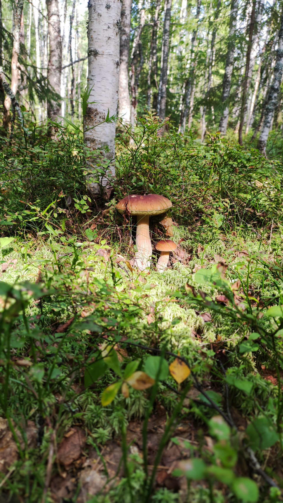 На изображении показаны белые грибы (Boletus edulis), растущие в лесу на фоне берёз и хвойных деревьев. На переднем плане видны два гриба: крупный и молодой, с коричневыми шляпками и толстыми ножками. Почва покрыта мхом и лесной растительностью, характерной для смешанных лесов. Белый гриб является ценным съедобным видом, традиционно собираемым в России. Фотография может использоваться в материалах о природе, грибной охоте, экологии и кулинарии.