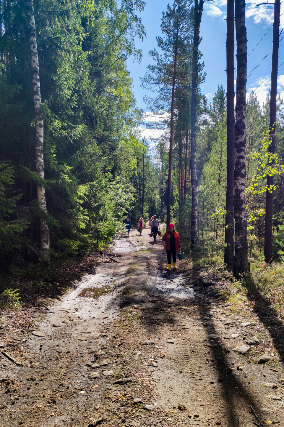 Фотография запечатлела группу людей, идущих по лесной дороге после сбора грибов. В кадре заметны мужчины и женщины с ведрами и корзинами. Дорога окружена высокими березами и соснами, а в лужах на тропе отражается свет. Сцена отражает совместный отдых на природе и традицию тихой охоты.