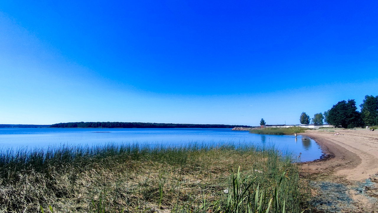 На фотографии изображен берег озера с песчаным пляжем и зарослями камыша. Вдали видна лесная полоса и здания у кромки воды. Небо ясное и ярко-синее, без облаков. Вода спокойная, отражающая цвет неба. Фото можно использовать в темах, связанных с природой, экотуризмом, отдыхом у воды и летними пейзажами.