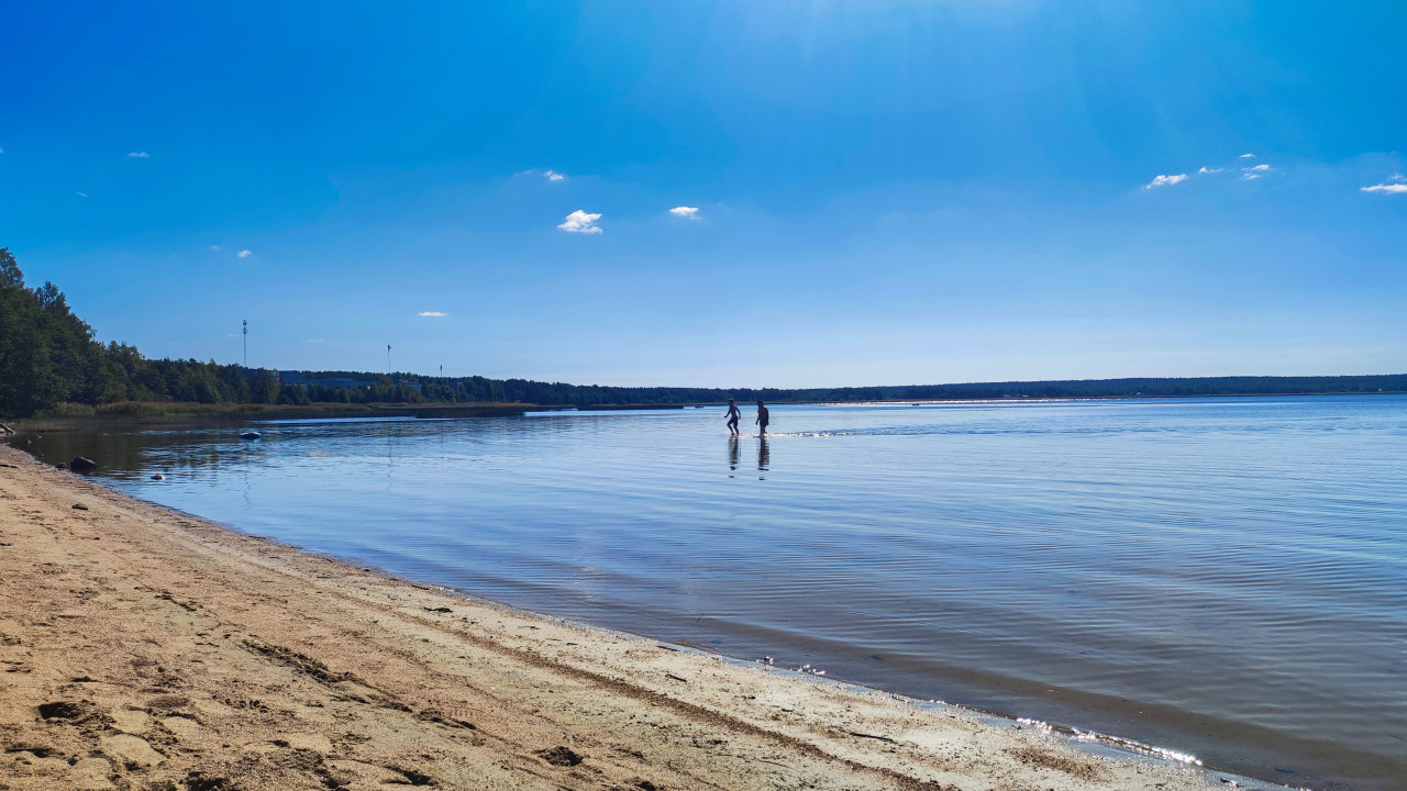 На фотографии изображен песчаный пляж и спокойная водная поверхность. Вдали, на мелководье, видны два человека, стоящих в воде. На горизонте — лесная полоса и сотовые вышки. Небо ясное, с редкими облаками, а вода отражает голубизну неба. Фото может использоваться для иллюстрации отдыха, туризма, летнего досуга и природных пейзажей.