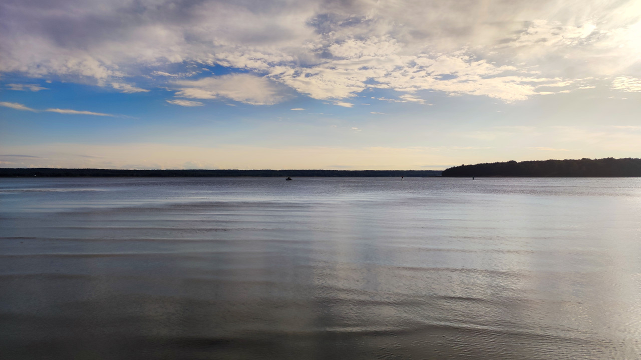 На фотографии изображен широкий водоем с ровной поверхностью воды, на которой заметны легкие ряби. В центре кадра на горизонте виднеется лодка, а вдали различим лесной массив. Небо частично покрыто облаками, которые подсвечены мягким светом, создающим спокойную атмосферу. Снимок отражает природный ландшафт без признаков архитектурных объектов или культурного наследия. Его можно использовать для публикаций о природе, отдыхе на воде, рыбалке и экологии.