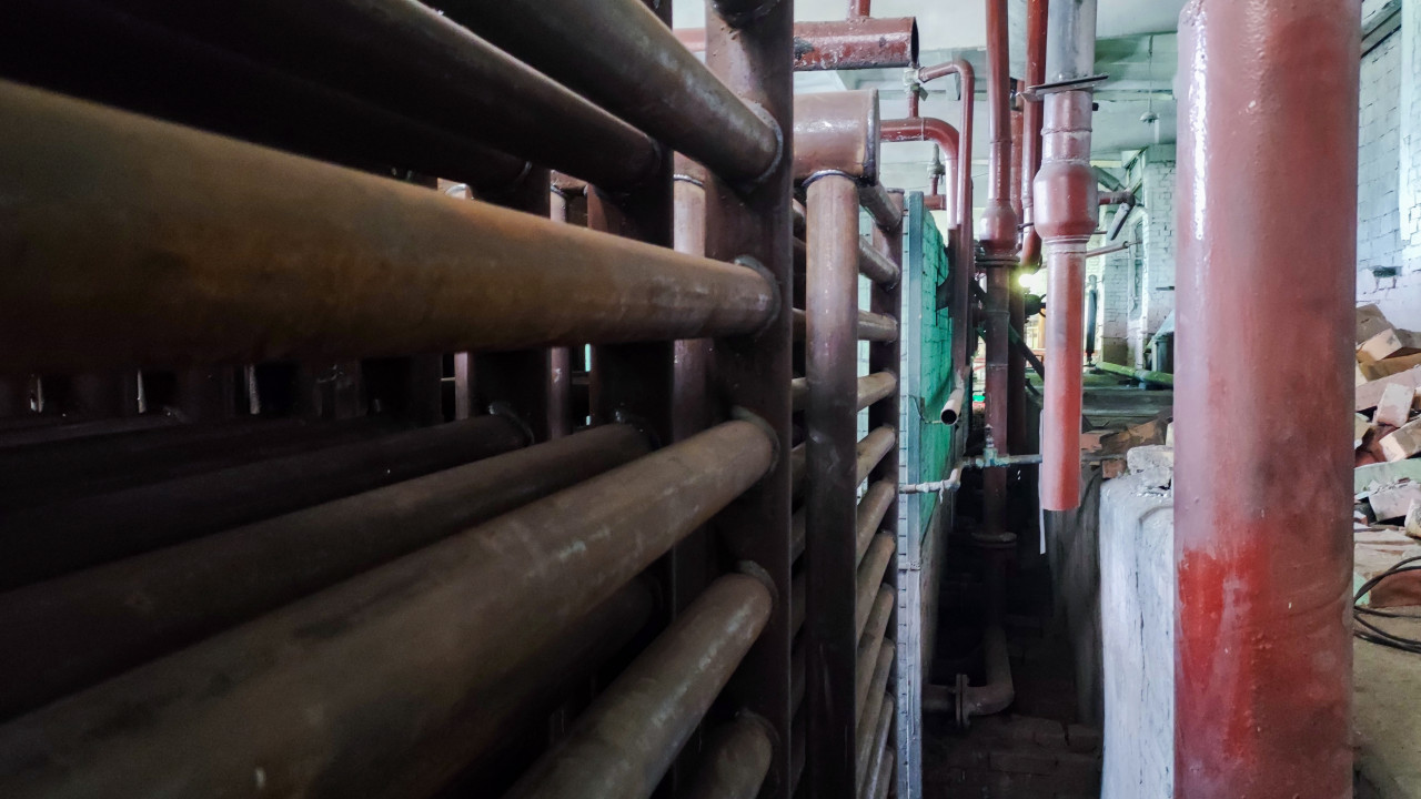 На изображении показаны горизонтальные металлические трубы котельного оборудования, установленные в ряду. Они соединены с другими инженерными элементами, включая вертикальные трубы и коммуникации красного цвета. Сбоку виднеется зеленая кирпичная стена, на полу разбросаны строительные материалы. Освещение приглушенное, характерное для промышленных помещений. Снимок демонстрирует внутренние системы отопления и устройство промышленной котельной.