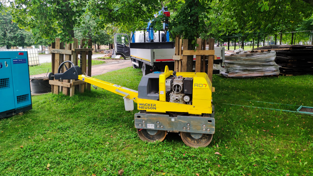 На фотографии изображён компактный каток Wacker Neuson RD7 жёлтого цвета, предназначенный для уплотнения грунта и асфальта. Техника установлена на зелёной траве рядом с поддонами, упакованными строительными материалами и грузовым автомобилем. На заднем плане виден генератор и деревья парка. Снимок отражает использование специализированной техники на строительной площадке и может применяться для иллюстрации тематики дорожно-строительных работ, благоустройства и инженерных технологий.