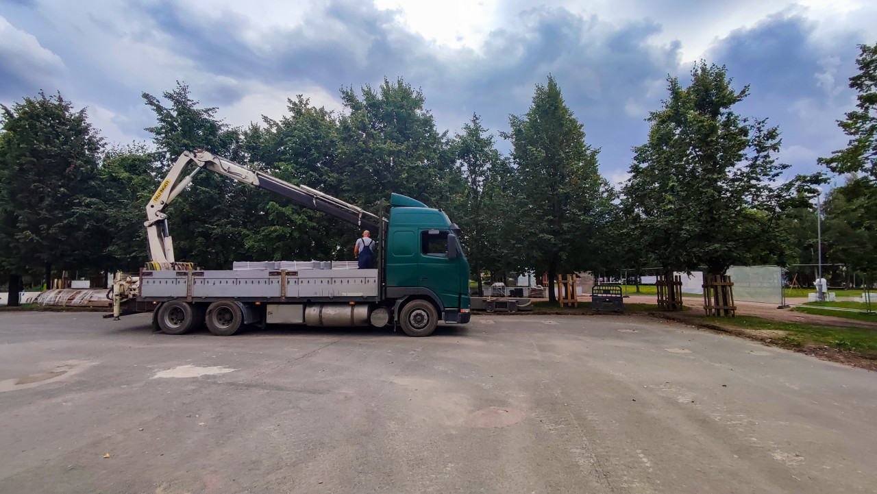 На фото показан зелёный грузовик с подъемным краном-манипулятором, установленный на площадке. На кузове размещены строительные материалы в виде бетонных блоков, рядом стоит рабочий. Вокруг расположены деревья и временные ограждения стройплощадки. Снимок демонстрирует логистику и транспортировку материалов на объекте и может использоваться для статей о строительных процессах, снабжении и организации работы строительных площадок.