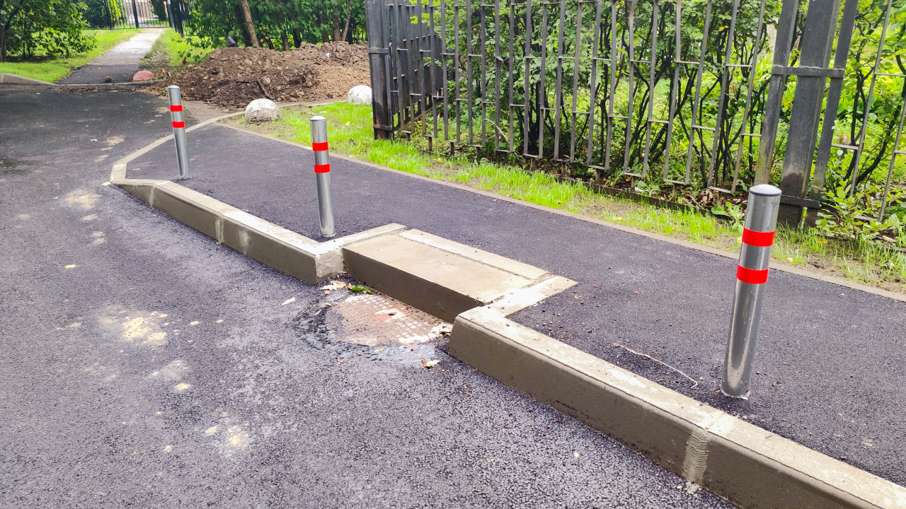 На фотографии изображен участок тротуара с металлическими ограничительными столбами с красными светоотражающими полосами. В центре виден люк, частично закрытый бетонными плитами и обрамленный бордюрами. Асфальтовое покрытие свежее, что указывает на недавние работы по благоустройству. Справа виден забор из металлических прутьев и зеленые насаждения. Снимок фиксирует процесс организации пешеходного пространства и защиты инженерных коммуникаций в жилом районе.