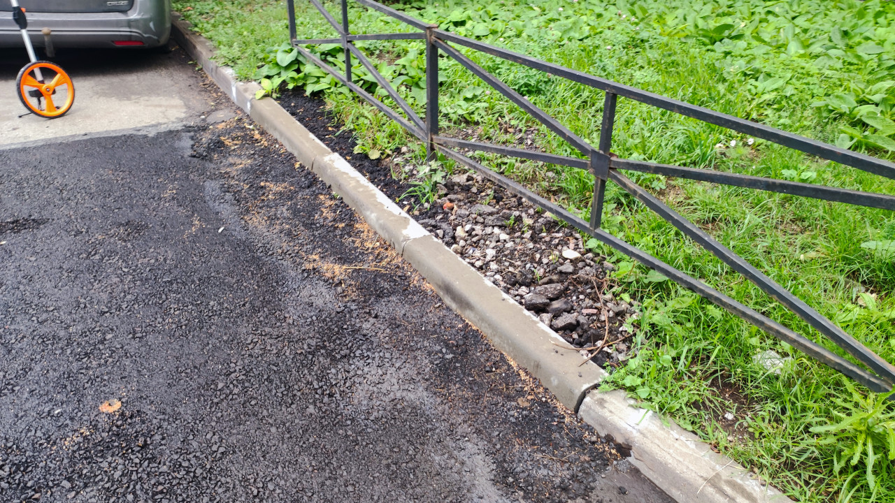 На снимке изображен участок придомовой территории с асфальтовым покрытием и бордюром, примыкающим к металлическому ограждению. За ограждением расположен зеленый газон с остатками строительного мусора и растительностью. Вдоль бордюра заметны следы недавних ремонтных работ, а на переднем плане — свежий асфальт. Фото фиксирует элементы благоустройства и ремонта дворового пространства у многоквартирного дома.