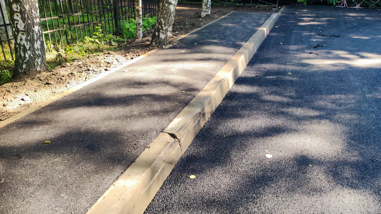На фотографии изображён участок тротуара и бордюра вдоль новой асфальтированной дороги. На переднем плане заметен дефект бордюрного камня с трещиной. Рядом растут деревья и трава, за ними установлен металлический забор. Поверхность дороги и тротуара свежая, с равномерным асфальтовым покрытием. Снимок может использоваться в материалах о качестве дорожных работ, городской среде и благоустройстве дворовых территорий.