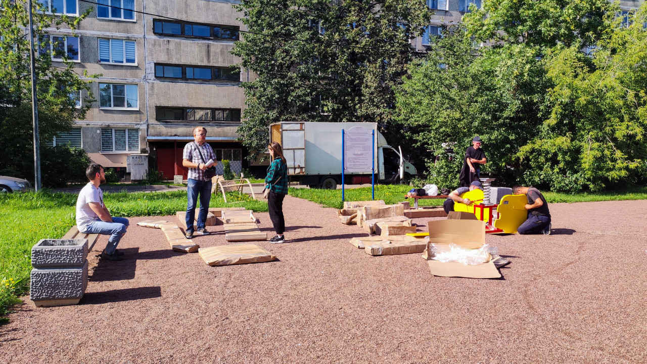 Монтаж оборудования на детской площадке во дворе жилого дома