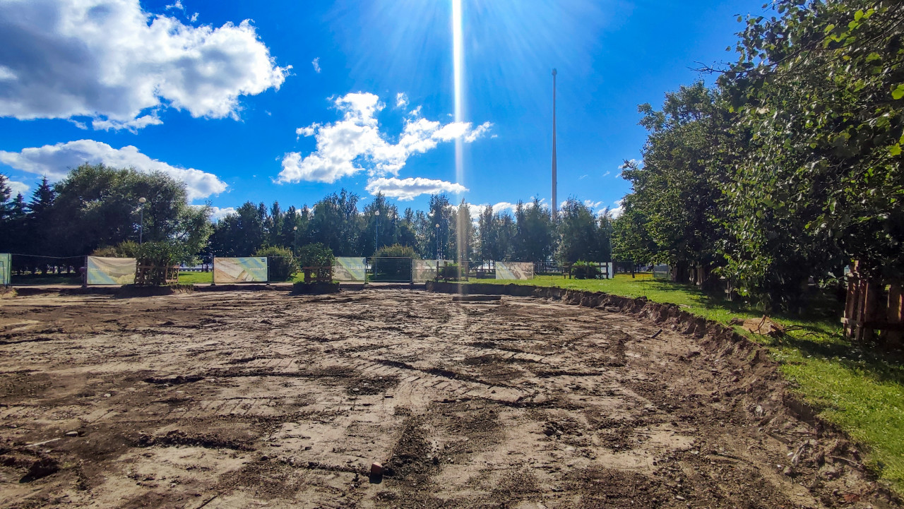 На фото изображён участок земли, подготовленный для строительства или благоустройства. Поверхность расчищена от травы и выровнена, по краям заметны следы техники. На заднем плане установлено ограждение с баннерами, за которым видны деревья и зелёные насаждения. Яркий солнечный день подчёркивает детали рельефа. Такой снимок иллюстрирует процесс начального этапа строительства, подготовку территории и работы по организации строительной площадки.