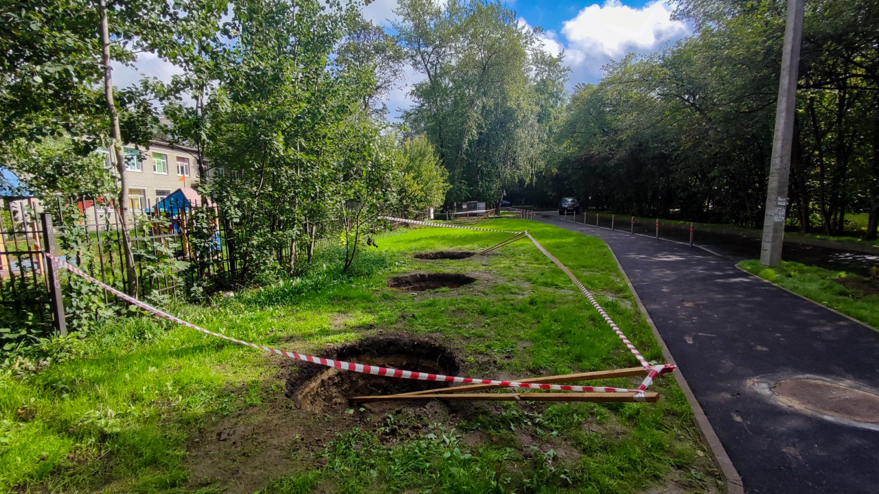 На фото запечатлен участок благоустройства с огороженными ямами на газоне, обозначенными красно-белой сигнальной лентой. Ямы вырыты вдоль пешеходной дорожки, где недавно уложено асфальтовое покрытие и установлены металлические ограничительные столбы. На заднем плане виден жилой дом и зеленые насаждения. Сцена фиксирует процесс озеленения дворовой территории с подготовкой мест для высадки новых деревьев.