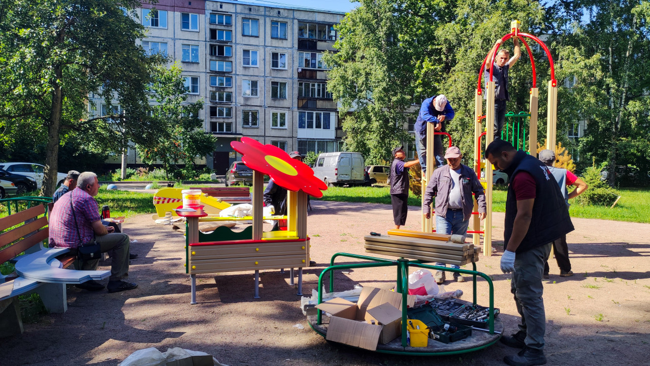На фотографии изображена установка детской игровой площадки во дворе многоэтажного жилого дома советской постройки. На переднем плане видны яркие элементы конструкции с декоративным цветком, рабочие собирают металлические и пластиковые детали, используя инструмент и материалы, разложенные на земле и на карусели. На заднем плане видны жилой пятиэтажный дом, деревья и припаркованные автомобили. Снимок фиксирует процесс благоустройства двора и установки современного оборудования для детского досуга.