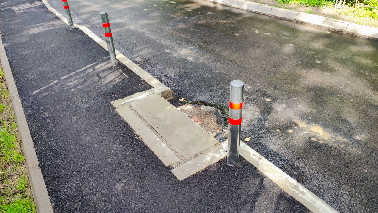Фотография показывает асфальтовое покрытие тротуара и проезжей части, где рядом с люком установлены бетонные плиты и ограничительные столбы. На снимке заметны бордюры, отделяющие тротуар от проезда, и металлический забор вдоль зеленой зоны. Поверхность асфальта свежая, видны следы проведения ремонтных или благоустроительных работ. Данный кадр фиксирует организацию инженерной инфраструктуры в жилом квартале.