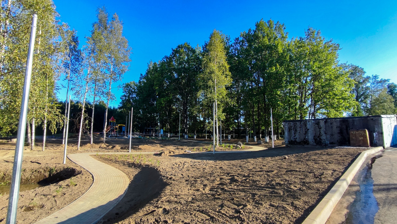 На фотографии показан участок благоустраиваемой территории с выложенной плиткой пешеходной дорожкой. Дорожка извивается среди молодых деревьев, рядом установлены металлические столбы для будущего освещения. На фоне видна детская игровая площадка с яркими конструкциями и зеленая зона с высокими деревьями. Снимок можно использовать для иллюстраций проектов благоустройства, городского озеленения и строительства общественных пространств.