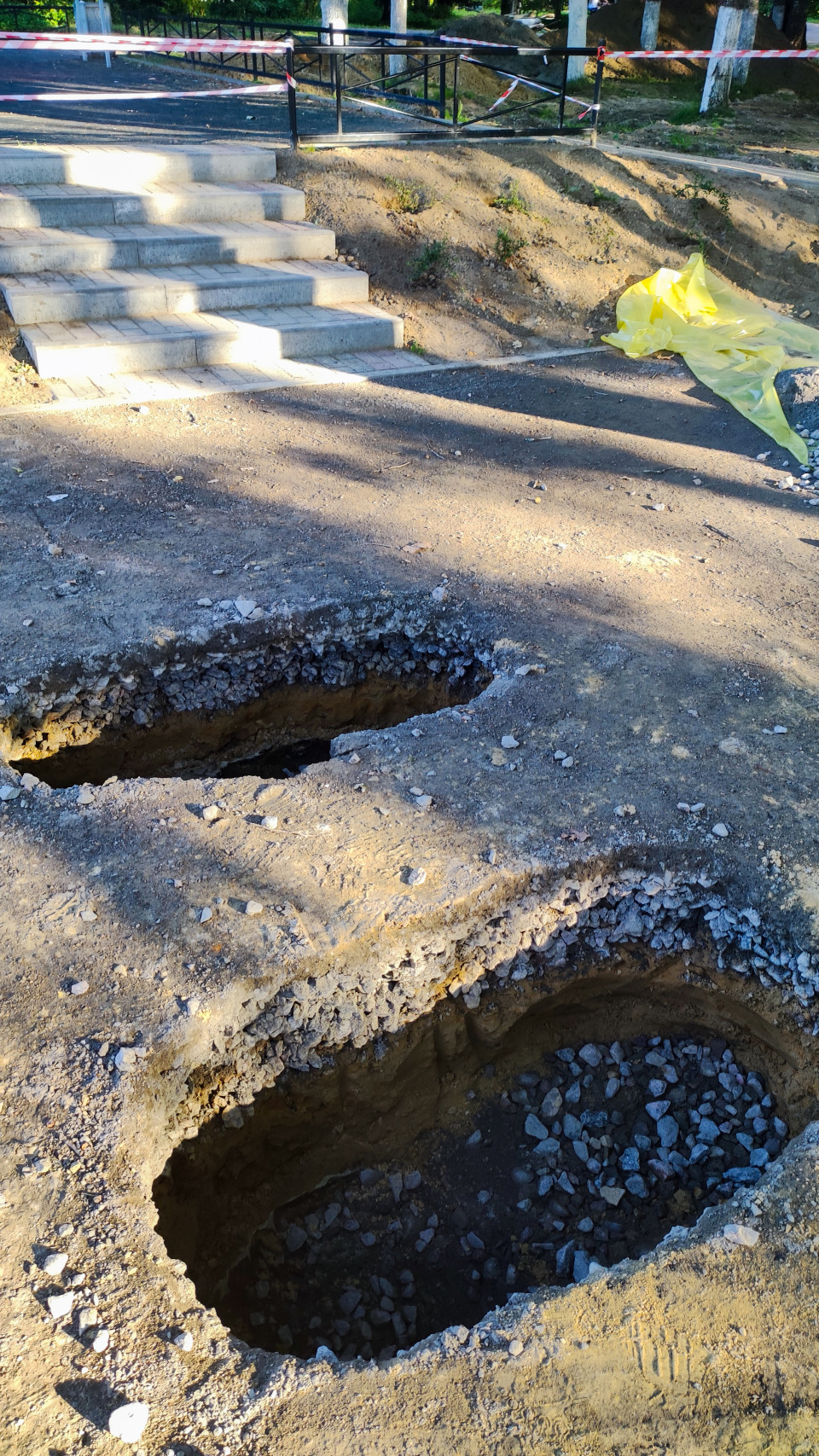 На фото изображён участок строительных работ с выкопанными углублениями в грунте возле лестницы, облицованной плиткой. Территория огорожена сигнальной лентой, видны следы строительных материалов и желтая плёнка сбоку. Работы связаны с благоустройством территории и подготовкой основания под установку малых архитектурных форм или инженерных элементов. Изображение можно использовать в публикациях о строительных процессах, благоустройстве и реконструкции общественных зон.