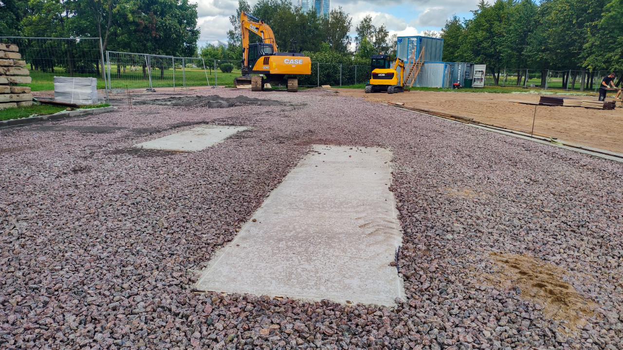 На снимке изображено основание площадки, засыпанное щебнем и частично покрытое бетонными плитами. На заднем плане видны строительные машины, включая экскаваторы, а также временные металлические бытовки. Территория ограждена забором, что указывает на активные строительные работы по созданию спортивной или общественной зоны. Снимок фиксирует этап подготовки территории и демонстрирует использование тяжелой строительной техники в процессе благоустройства.
