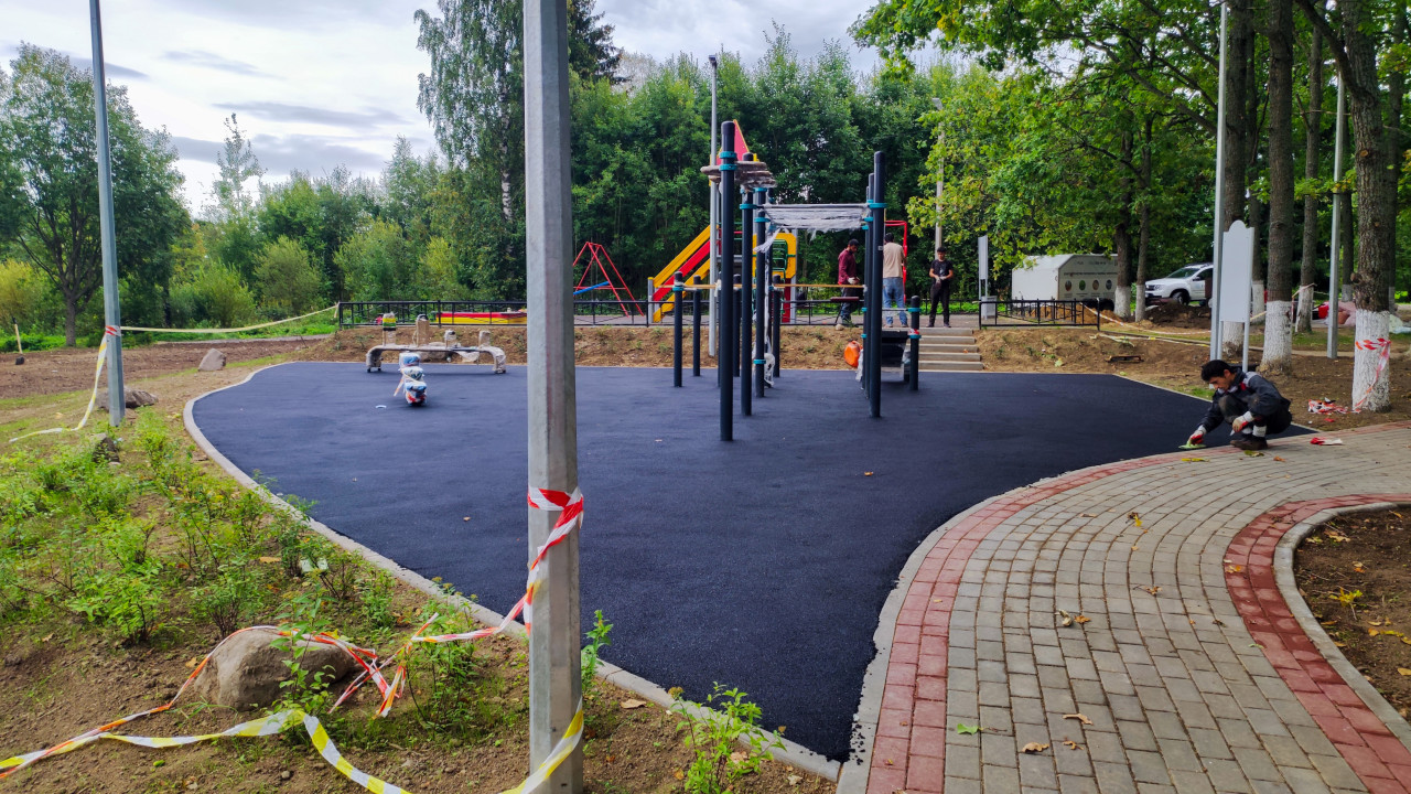 На фотографии изображен процесс обустройства спортивной и игровой площадки на открытом воздухе. На переднем плане — новая асфальтированная зона с установленным оборудованием для занятий спортом, по периметру проложена тротуарная плитка. Видны рабочие, завершающие монтажные работы и благоустройство территории. На заднем плане — деревья и зеленая зона. Снимок фиксирует современный этап обустройства дворовой инфраструктуры.