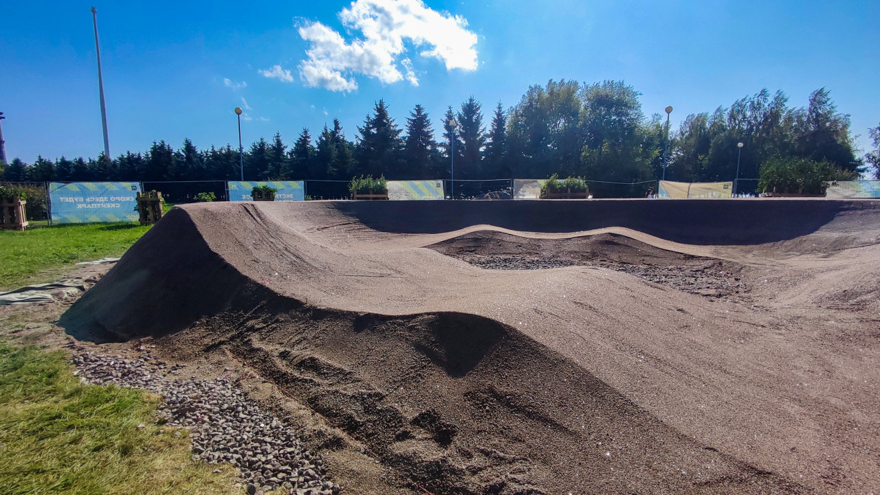 На снимке изображены земляные насыпи и фигурные элементы трассы будущего велотрека, расположенного в парке. На переднем плане видна крупная фигура с наклонным уклоном и плавными переходами. Поверхность утрамбована и подготовлена к дальнейшему укреплению. Вдоль периметра установлены ограждения с баннерами. На заднем плане заметна зелёная зона с деревьями и уличным освещением. Фотография фиксирует процесс строительства спортивного объекта для любителей велосипедного спорта.