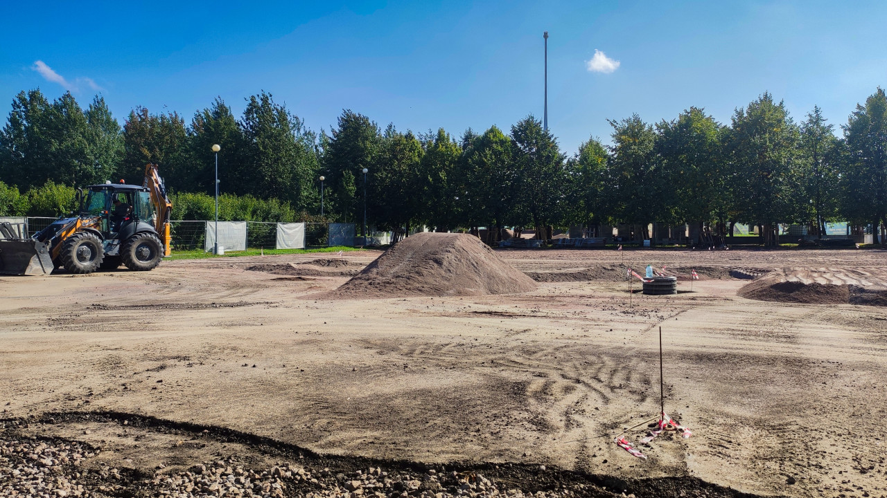На фотографии запечатлена строительная площадка, где ведутся земляные работы. На переднем плане расположен экскаватор, рядом насыпи песка и щебня. На заднем плане видна линия деревьев и строительный забор. Работы направлены на подготовку территории под дальнейшее благоустройство или возведение объекта. Снимок можно использовать для иллюстрации строительных процессов и работы тяжёлой техники.