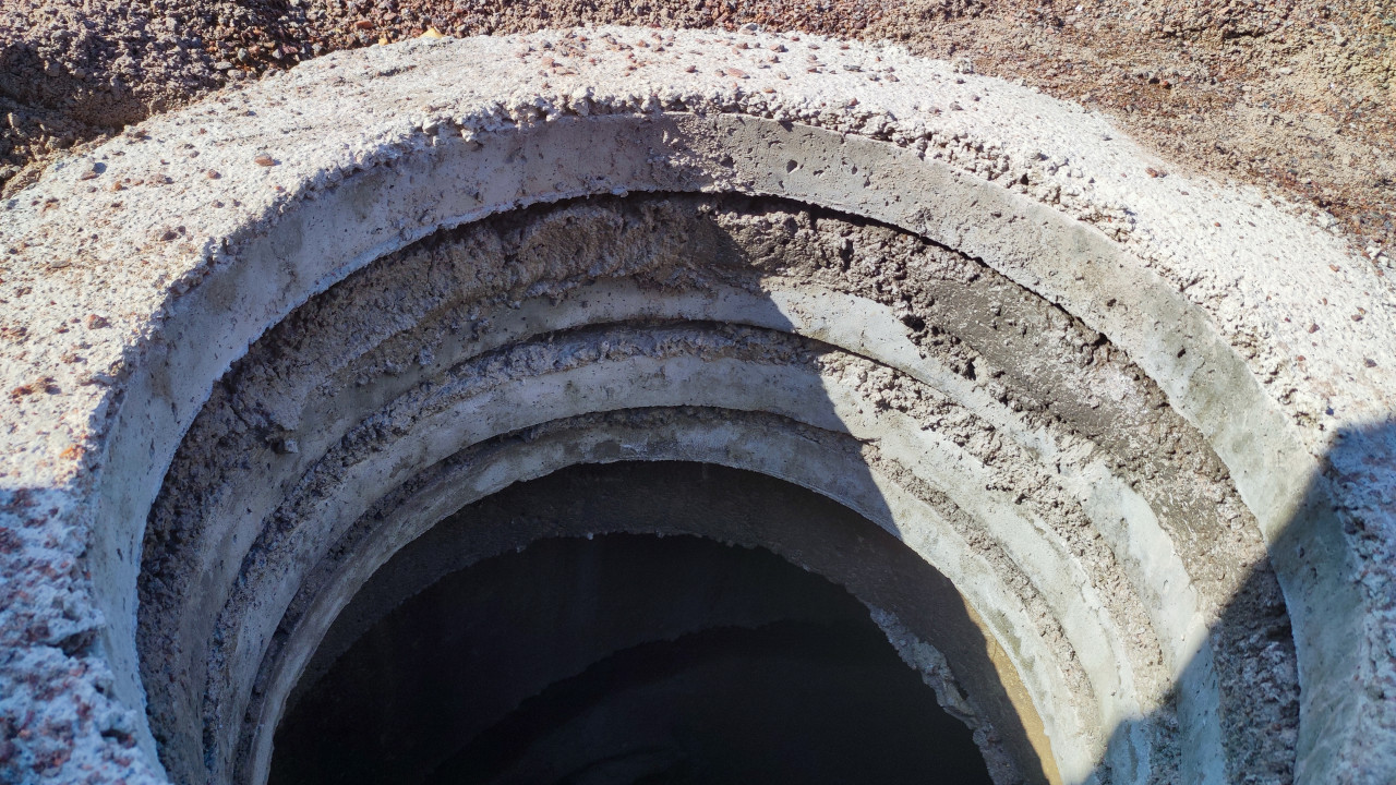 На снимке представлен бетонный колодец, снятый сверху под углом, что позволяет рассмотреть структуру из бетонных колец. Видны слои цемента и шероховатости на поверхности конструкции. Колодец установлен в насыпи грунта и является частью инженерных коммуникаций для водоотведения или канализационных систем. Изображение иллюстрирует устройство подземных инженерных сооружений в процессе строительных работ.