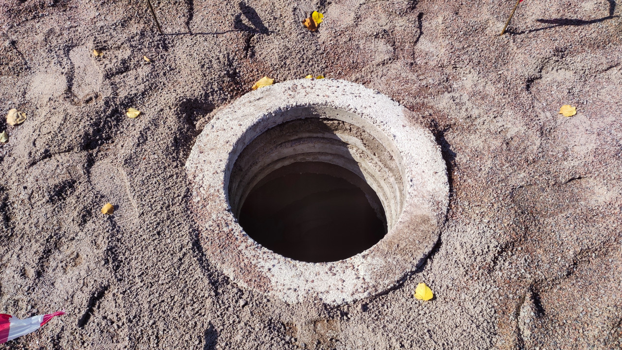 На фотографии изображён бетонный люк, установленный в насыпанном слое щебня и грунта. Круглая конструкция состоит из нескольких бетонных колец, уходящих в землю. Объект окружён землёй и камнями, видны остатки строительных работ. Красно-белая лента используется для обозначения строительной зоны. Снимок отражает процесс благоустройства территории и обустройства инженерных сетей.