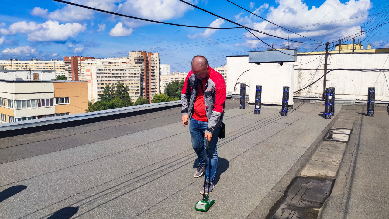 Проверка гидроизоляции сканером влажности на крыше здания