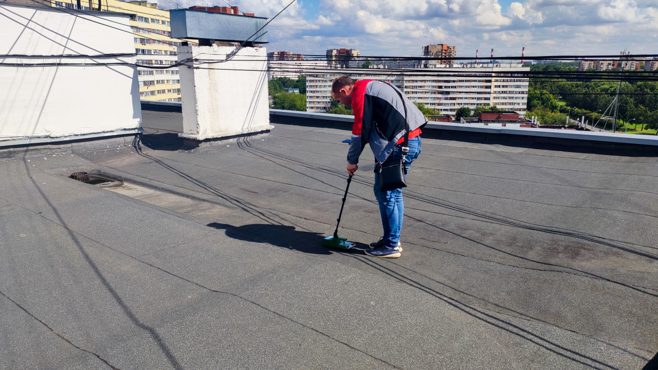 крыша жилой дом многоэтажка ремонт крыши строительные работы гидроизоляция рулонный материал рабочий инженер обследование зданий контроль качества диагностика оборудование кровельные работы специалист обследование плоская крыша многоквартирный дом панельный дом прибор Tramex влагомер измерительный прибор строительные технологии контроль влажности инженерные работы профессиональное оборудование ремонт эксплуатация инженерное оборудование поверхность тестированиеПохожие фотографии