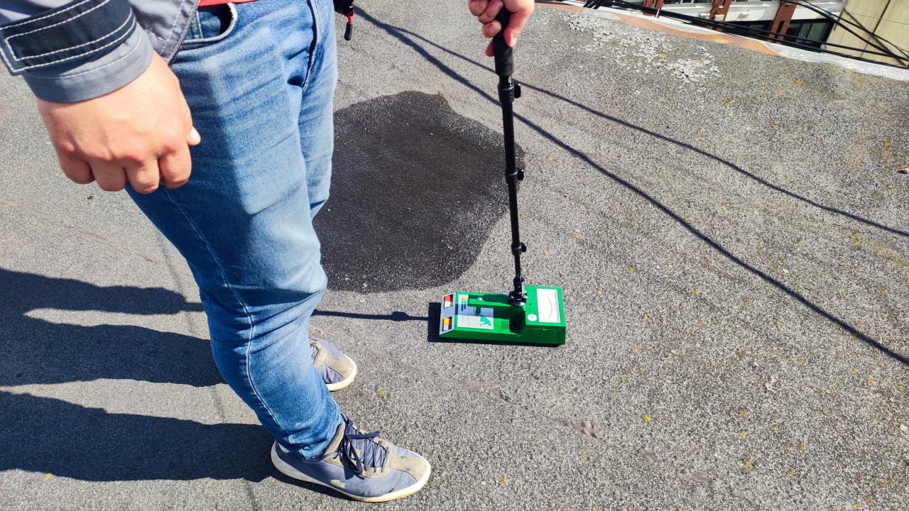 На фотографии изображён участок крыши многоэтажного дома, где человек в джинсах и рабочей куртке проводит измерения сканером влажности зелёного цвета. Устройство установлено на участок с потемневшим пятном от влаги. На фоне видны провода и фрагменты городских зданий. Снимок иллюстрирует процесс строительной экспертизы и может использоваться в материалах о контроле состояния гидроизоляции и инженерных обследованиях.