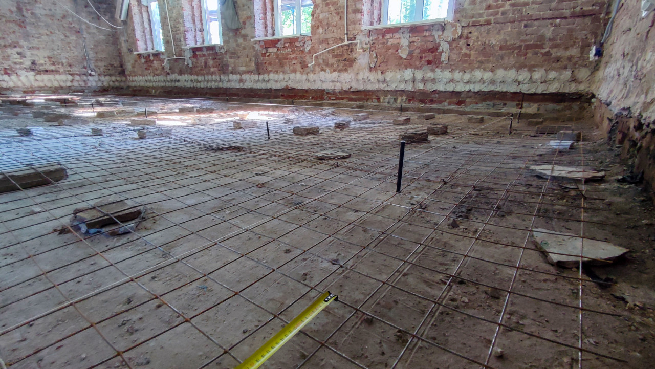На фото показано помещение здания с кирпичными стенами, где ведётся капитальный ремонт. На переднем плане видна арматурная сетка, уложенная на основание пола и закреплённая кирпичами и металлическими элементами. Через окна поступает дневной свет, освещая пространство. На заднем плане заметны следы демонтажа штукатурки и инженерные коммуникации. Снимок демонстрирует подготовительный этап перед заливкой бетонного пола.