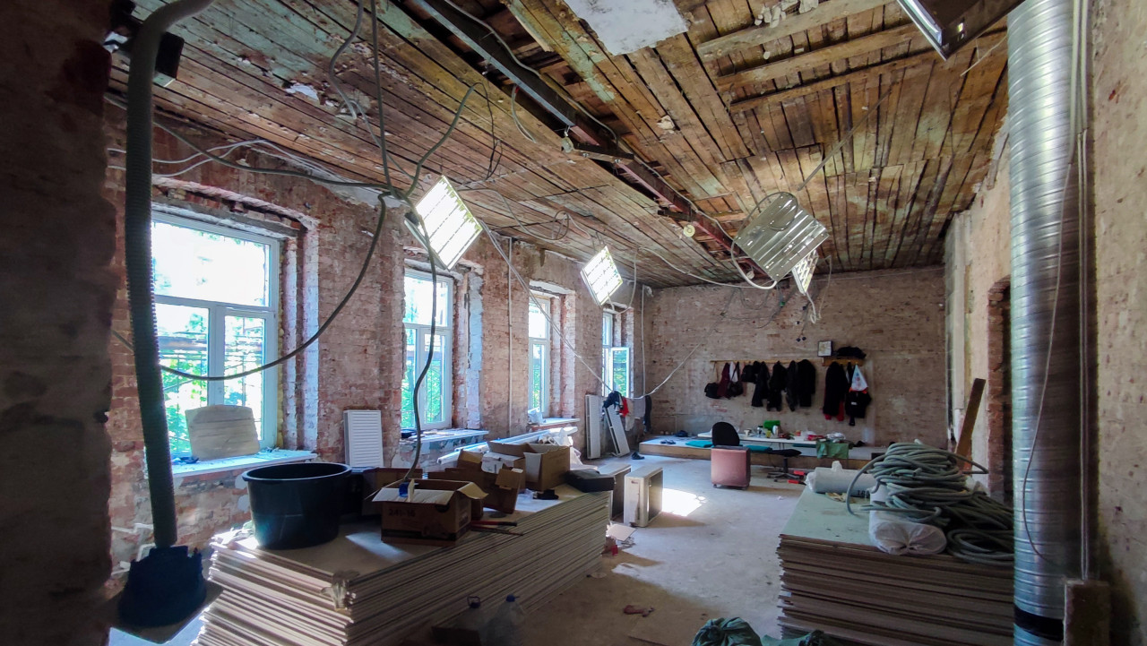 На изображении показано помещение старого здания в процессе ремонта. Кирпичные стены лишены отделки, потолок выполнен из деревянных досок с проложенной электропроводкой. На полу размещены строительные материалы: листы гипсокартона, кабельные бухты, коробки и инструменты. На стене закреплены крючки с одеждой рабочих, присутствует офисное кресло и импровизированное место для отдыха. На потолке подвешены временные строительные светильники. Фото демонстрирует процесс реконструкции внутренних пространств.