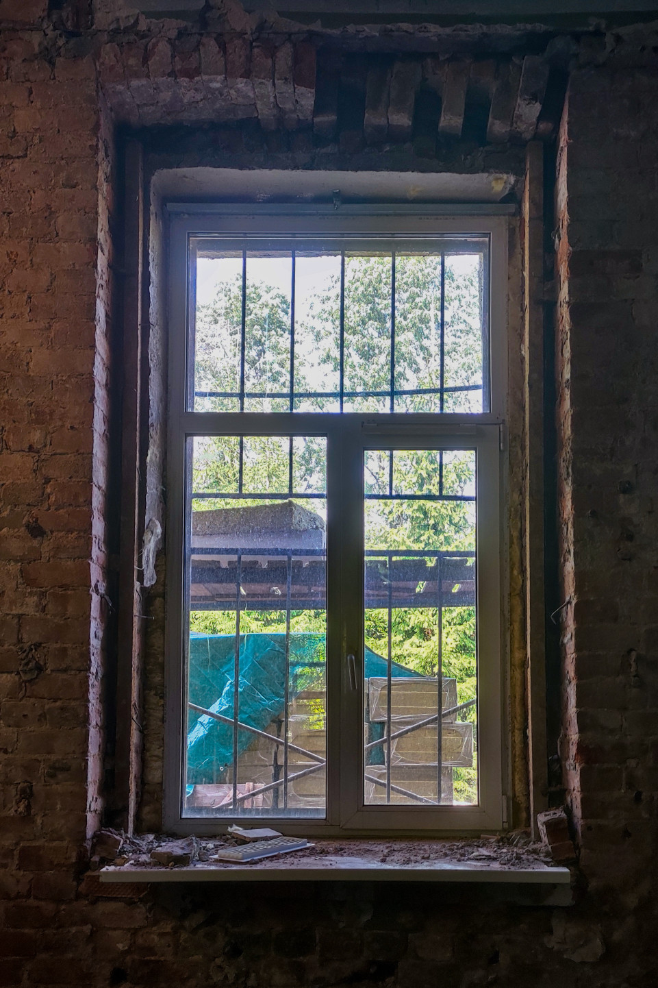 На фото изображено окно с пластиковой рамой и металлической решёткой, установленное в кирпичную стену. Вокруг проёма видны следы демонтажа старой отделки и неровности кладки. За окном заметны строительные леса и зелёные деревья. Снимок фиксирует процесс восстановления здания и его инженерных элементов.