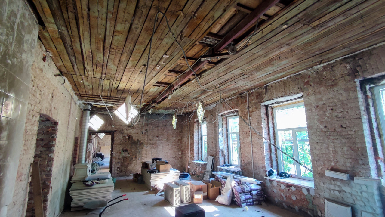 Фотография демонстрирует комнату здания в процессе капитального ремонта. Потолок состоит из деревянных досок, часть которых повреждена и требует замены. К потолку подвешены временные строительные светильники и кабели. Вдоль стен расположены окна с пластиковыми рамами. На полу лежат строительные материалы: листы гипсокартона, мешки со смесью и упаковки. В помещении сохраняется старый кирпичный каркас. Снимок отражает этап реконструкции и подготовки здания к дальнейшей отделке.