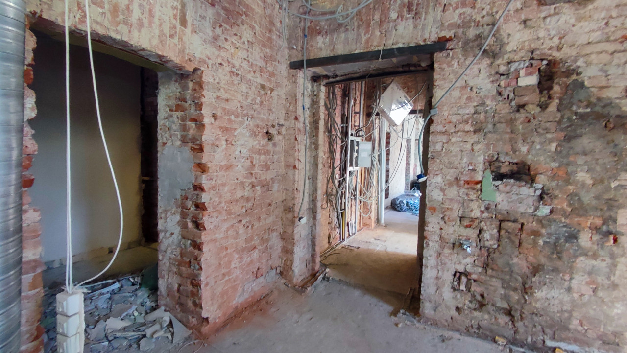На снимке запечатлен участок интерьера здания в стадии реконструкции. Кирпичные стены лишены отделки, видны дверные проемы с оголенными краями кладки. Вдоль стен и потолка проходит множество кабелей, часть из которых свисает вниз. На полу заметны строительные следы и мусор. В дальнем плане виден установленный распределительный щит. Фото может использоваться для иллюстрации строительных работ и демонтажа внутри исторических зданий.