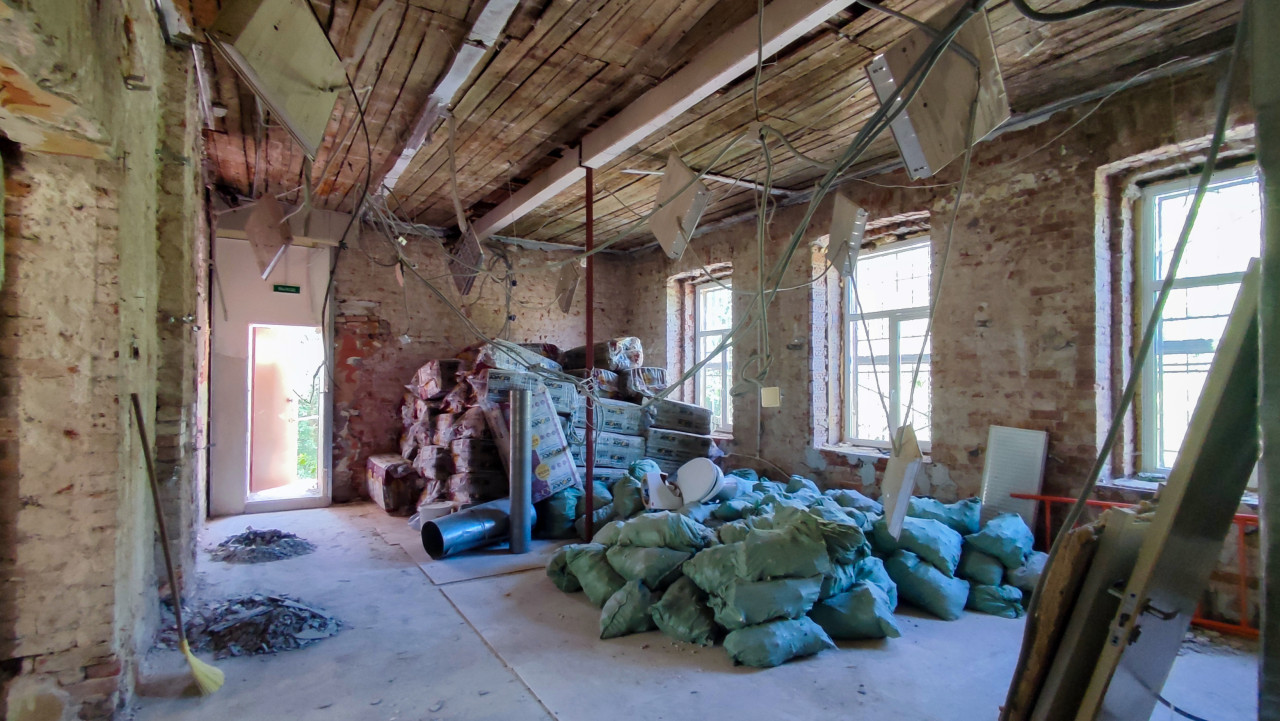 На фотографии показано помещение старого кирпичного здания на этапе реконструкции. Видны обнажённые кирпичные стены, деревянное перекрытие потолка с демонтированными светильниками и свисающими кабелями. В центре комнаты сложены мешки с строительным мусором и материалы, включая упаковки утеплителя и металлические трубы. В кадре также заметны проёмы окон с металлическими рамами и входная дверь. Сцена отражает процесс капитального ремонта, характерный для восстановления исторических или общественных зданий. Изображение может быть использовано для иллюстрации строительных работ, реконструкции и архитектурных преобразований.