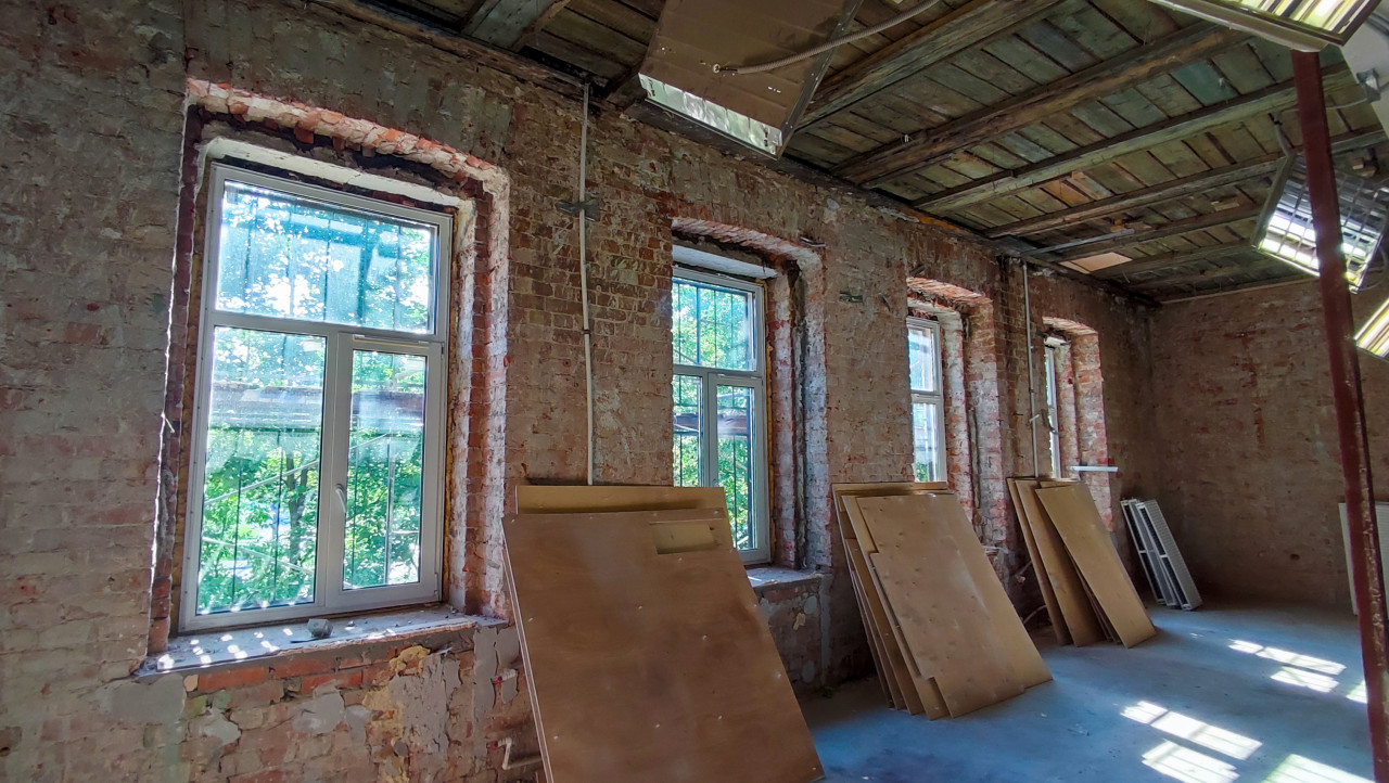 На снимке показано помещение здания на стадии капитального ремонта. Стены выполнены из кирпича без отделки, на них видны следы старой штукатурки. Потолок состоит из деревянных досок и балок, усилен металлической конструкцией. Вдоль стен стоят листы фанеры и строительные материалы. Через окна с пластиковыми рамами проникает солнечный свет. Изображение отражает этап реконструкции старого здания, подготовку стен и перекрытий к дальнейшим работам.