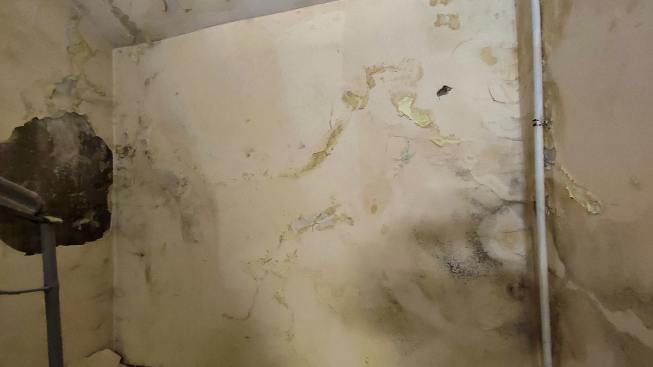 На фотографии запечатлена стена в здании с видимыми следами износа. Поверхность стены покрыта пятнами влаги, разводами, следами плесени и трещинами. В углу кадра заметна металлическая труба, а часть штукатурки обвалилась, обнажая более старые слои. Состояние указывает на длительное воздействие влаги и необходимость капитального ремонта. Снимок может быть использован для иллюстрации строительных дефектов, проблем гидроизоляции и необходимости восстановления конструкций.